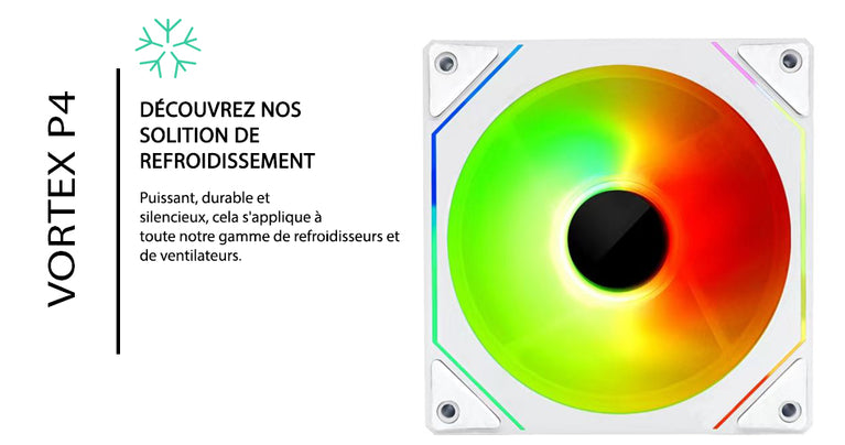 Boostez le refroidissement et le style de votre PC avec nos ventilateurs Vortex P4 ARGB haute performance. Conçus pour offrir un excellent flux d’air tout en restant silencieux, ils s’intègrent parfaitement dans n’importe quelle configuration gaming ou professionnelle.